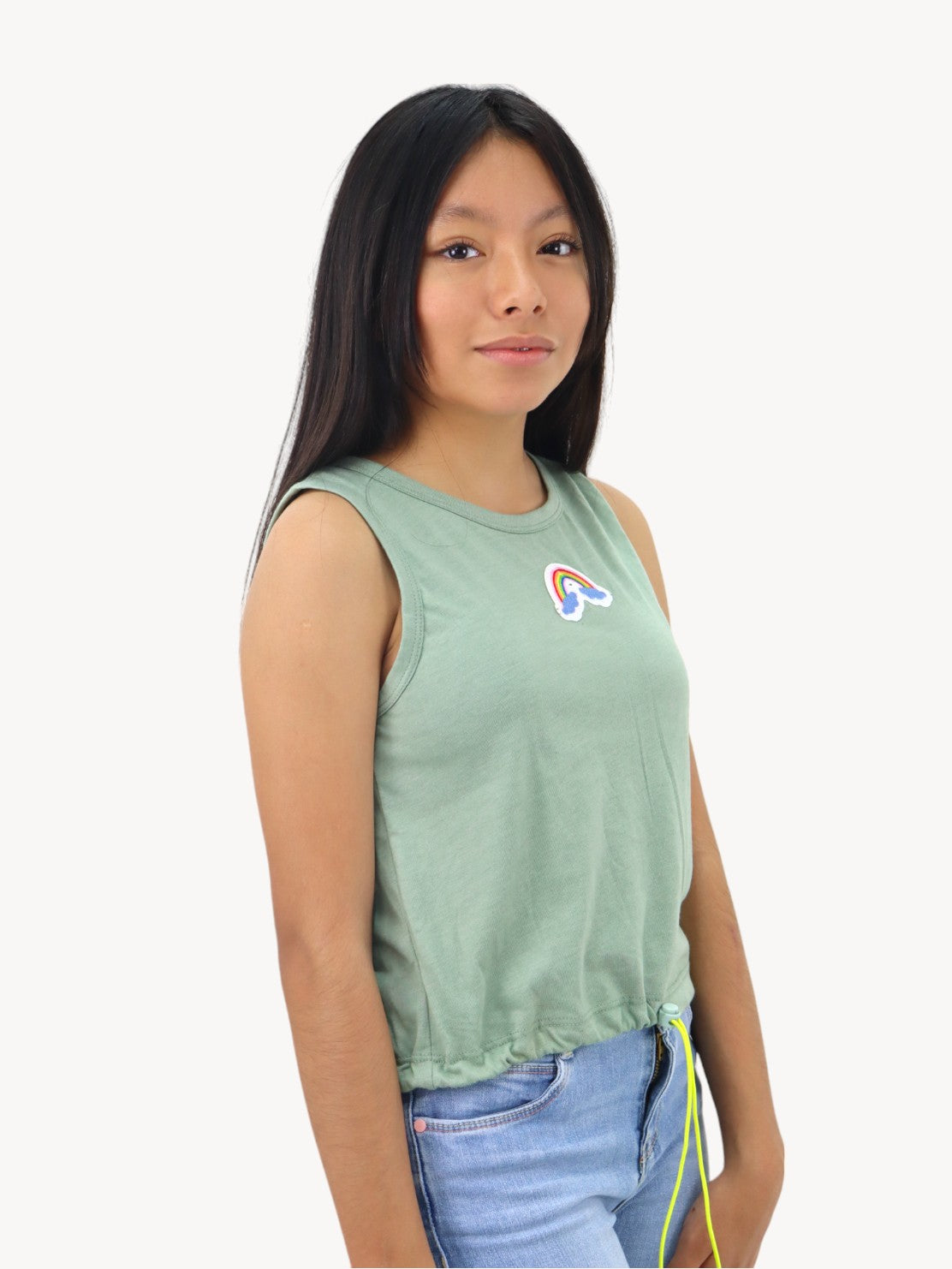 Playera tank color verde con gráfico de arcoíris y jareta ajustadora