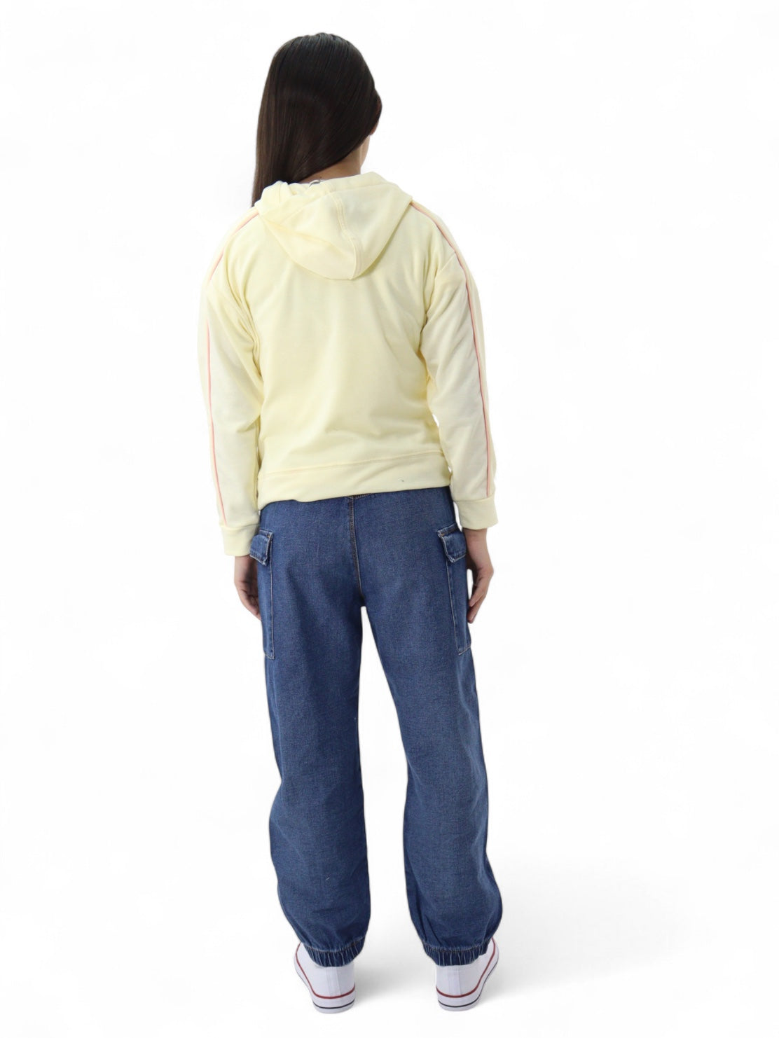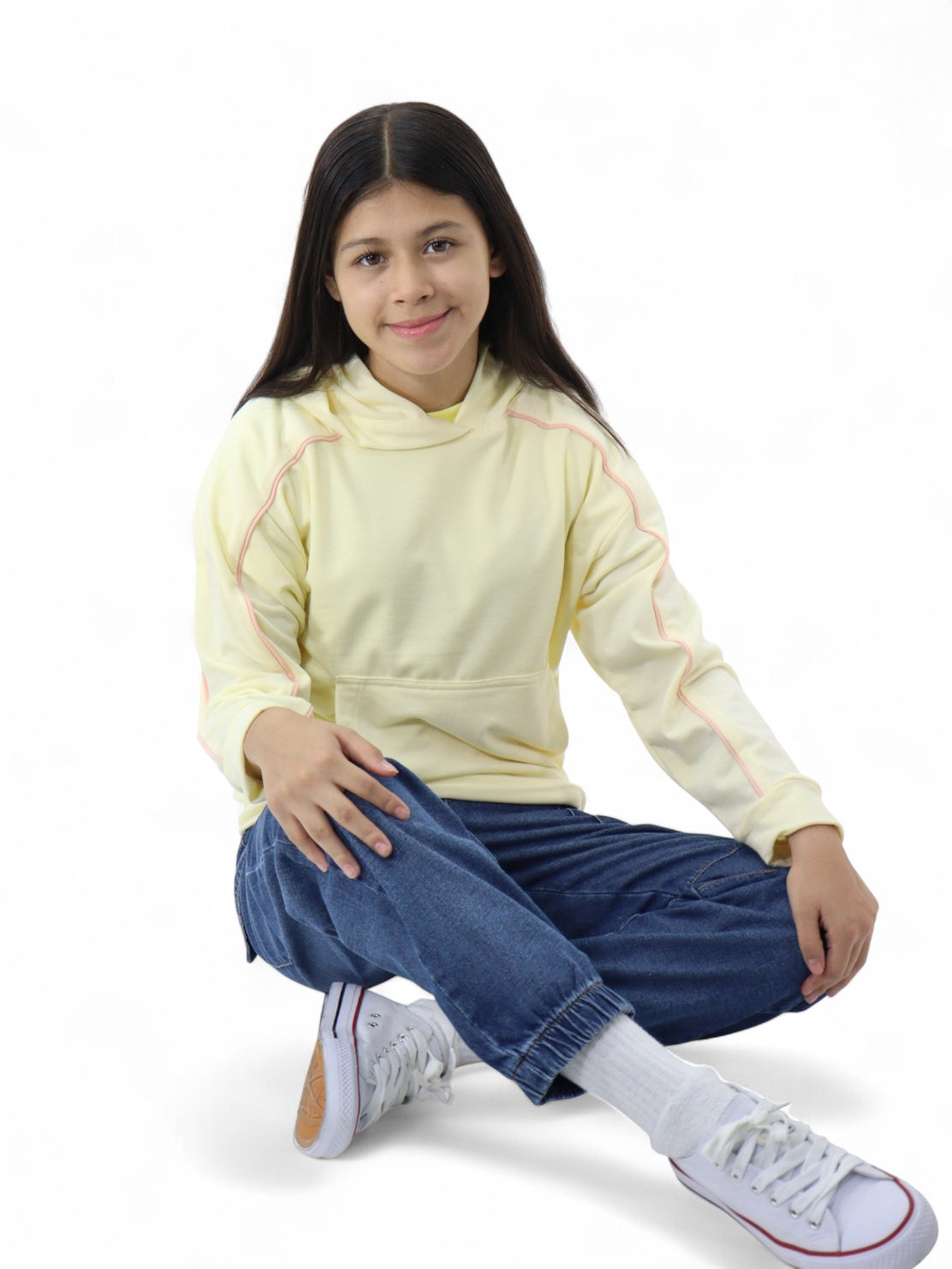 Sudadera con capucha y cangurera de color amarillo con franjas