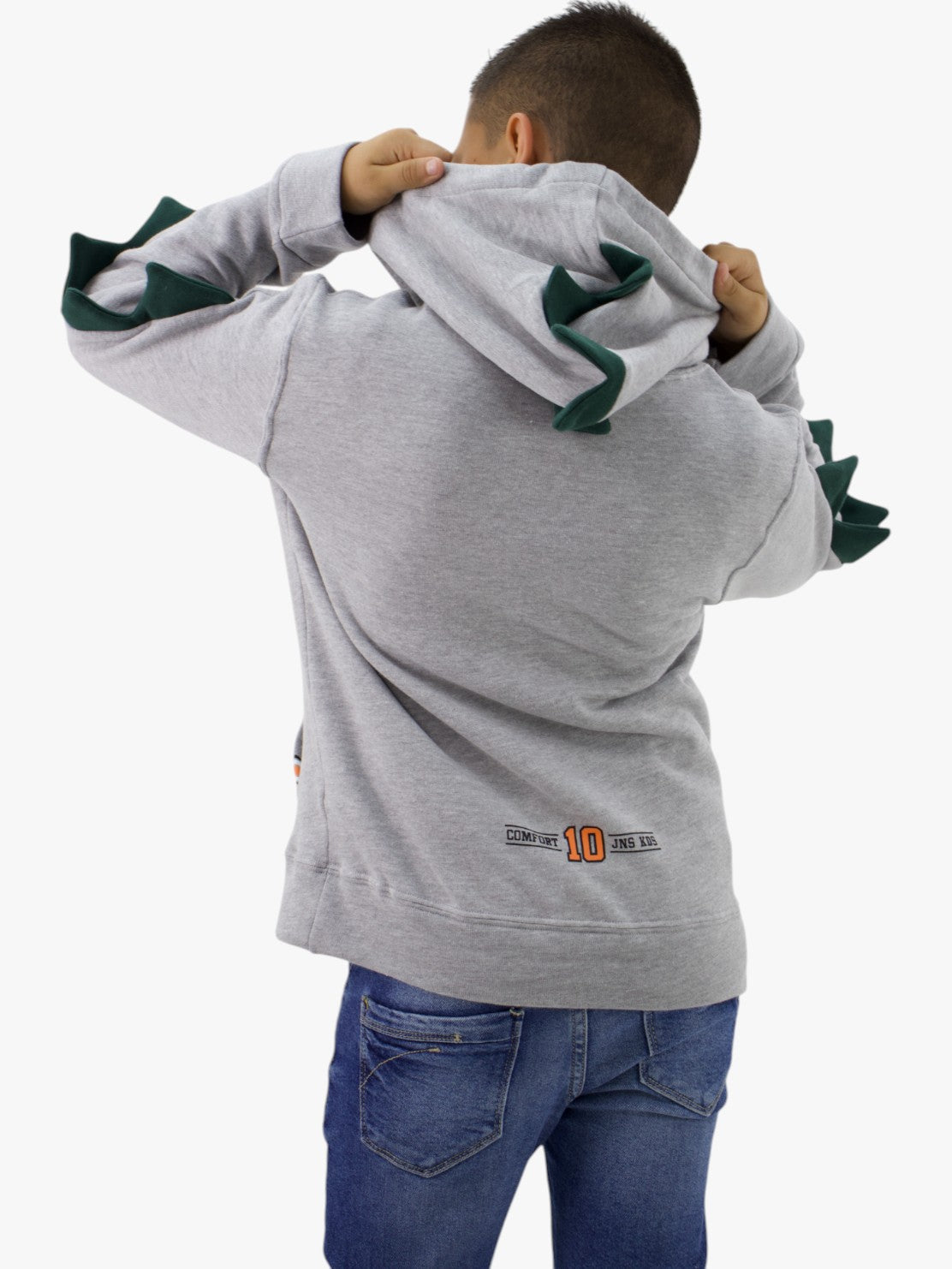 Sudadera con diseño de dinosaurio gris, con bolsa frontal tipo canguro.