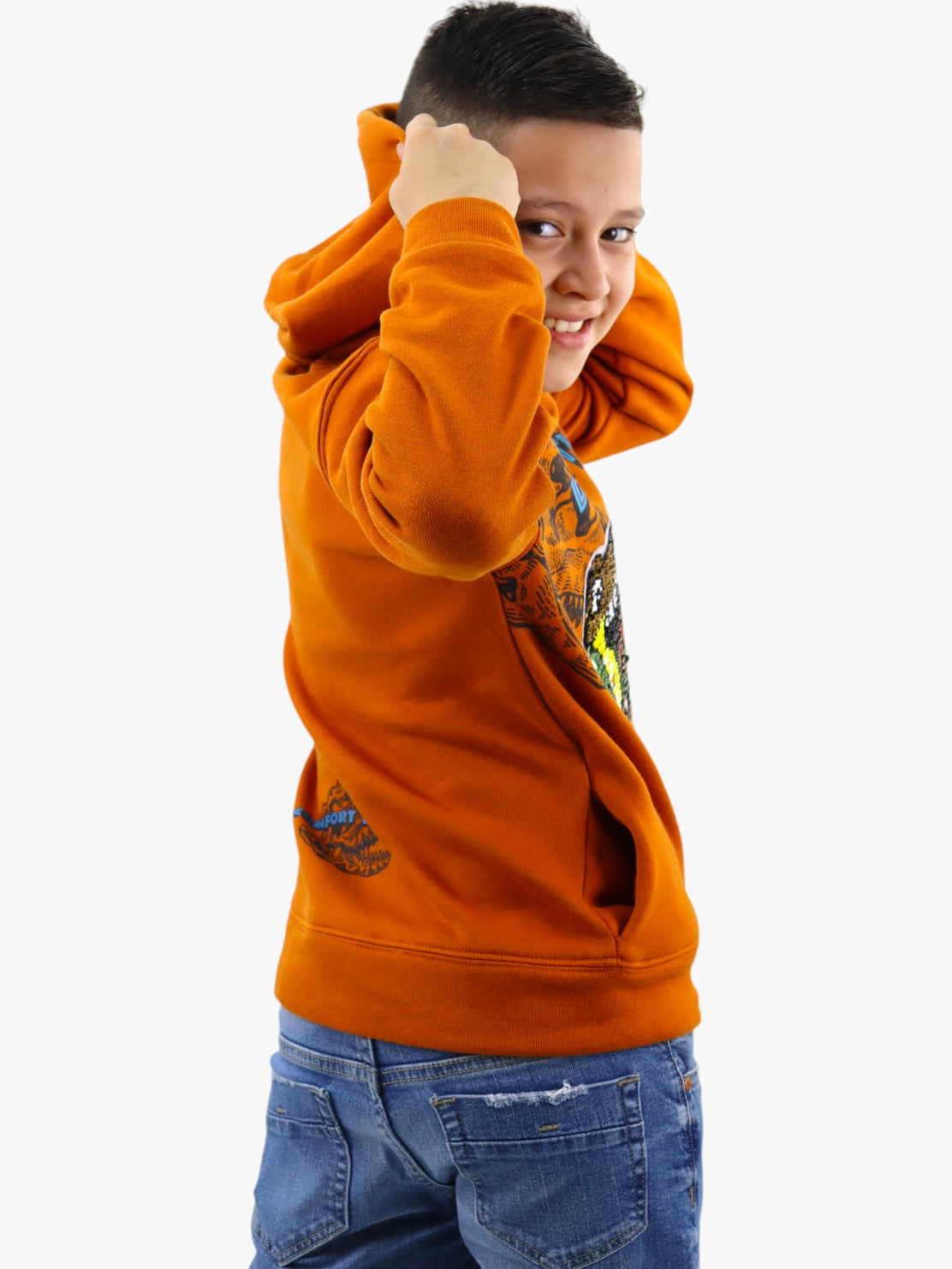 Sudadera con capucha de color naranja, con lentejuela reversible de dinosaurio