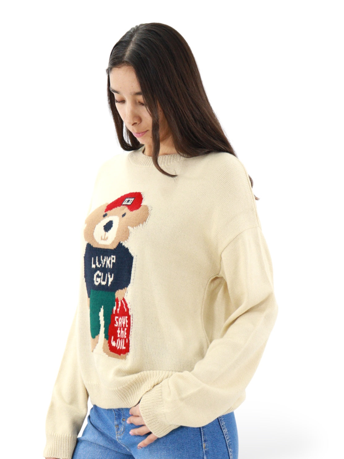 Suéter cerrado de color beige con estampado de oso