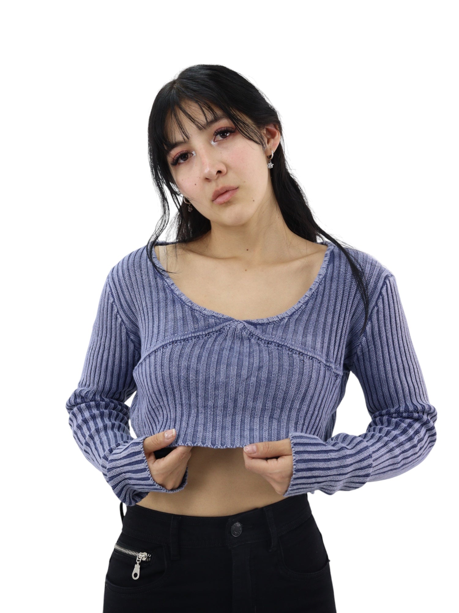 Suéter corto azul, manga larga, cuello redondo, suave, casual