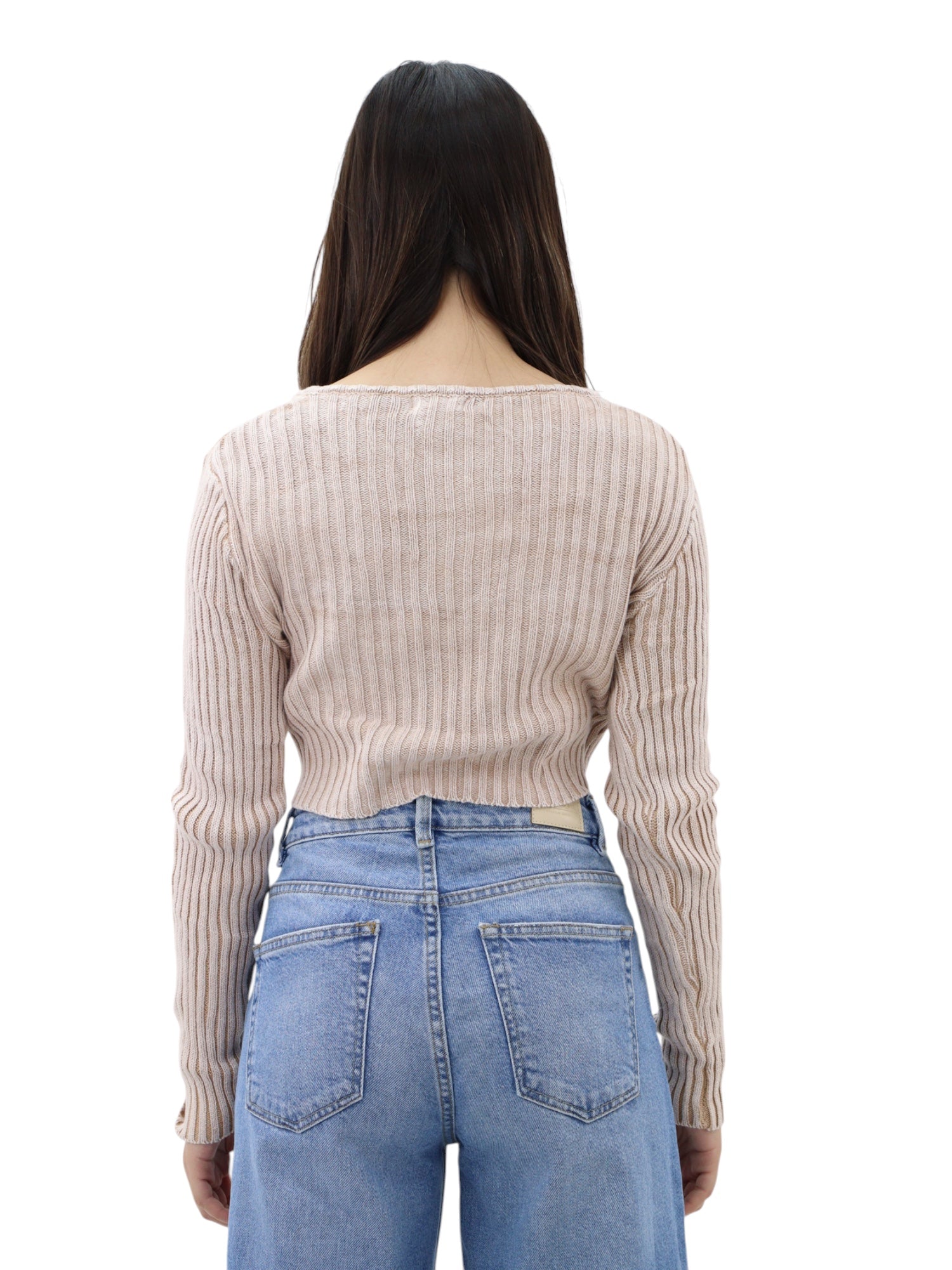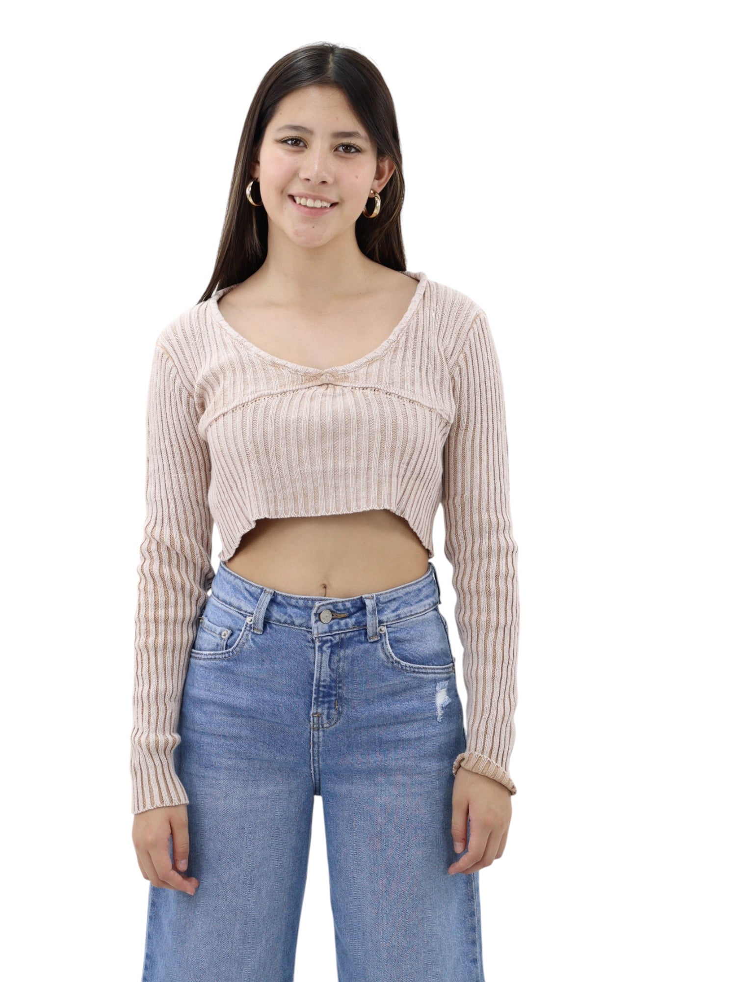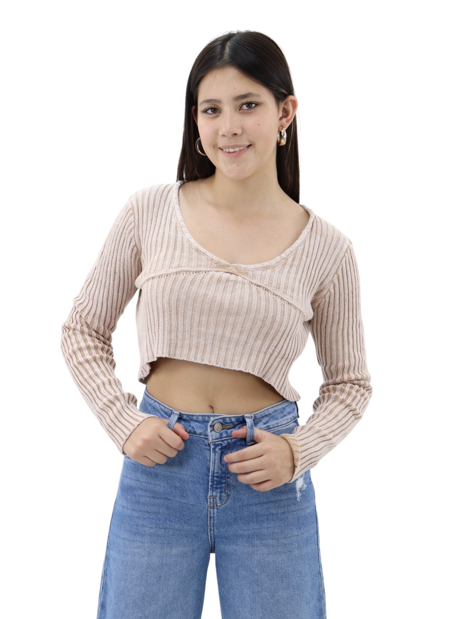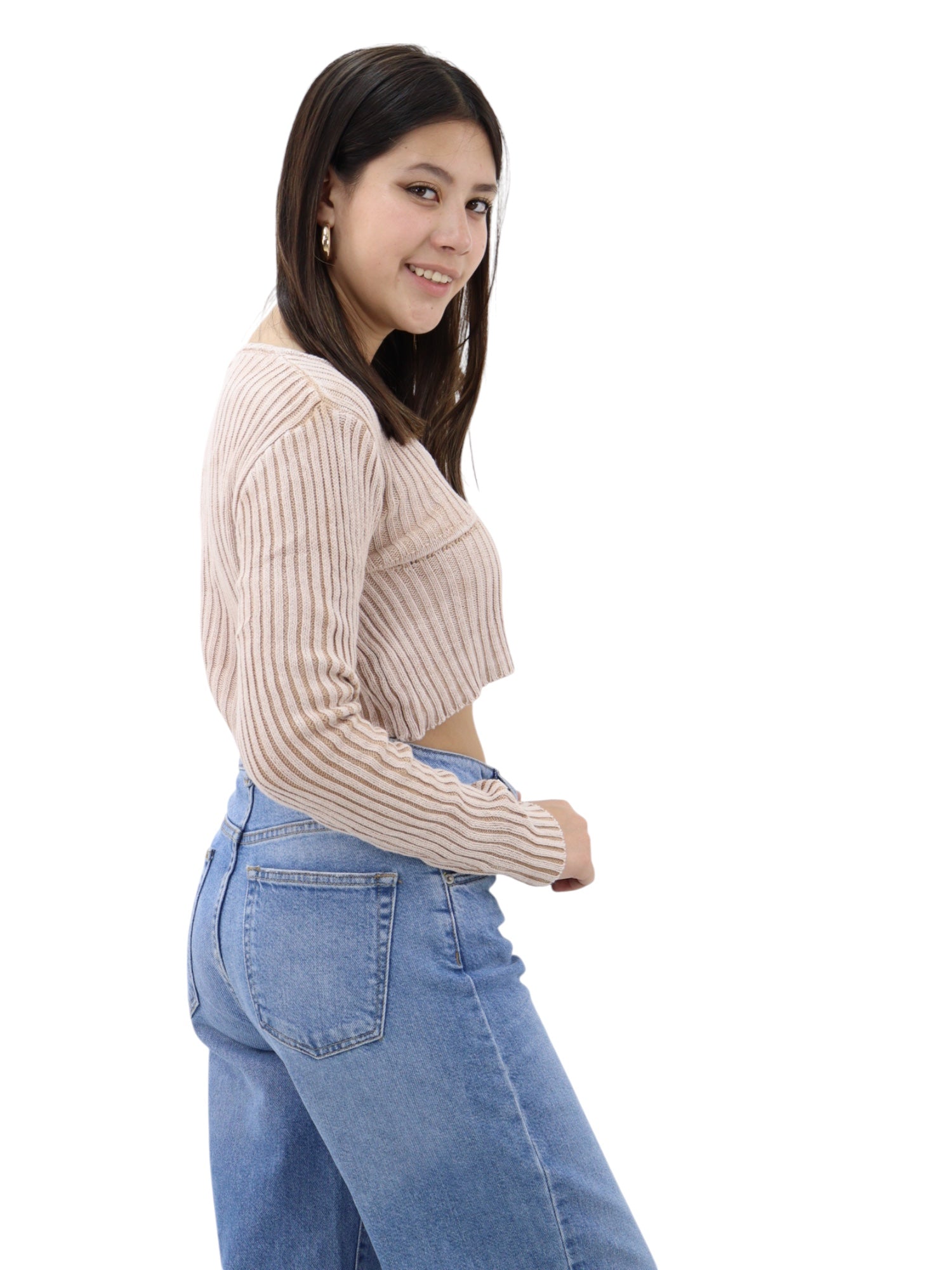Suéter corto beige, manga larga, cuello redondo, suave, casual