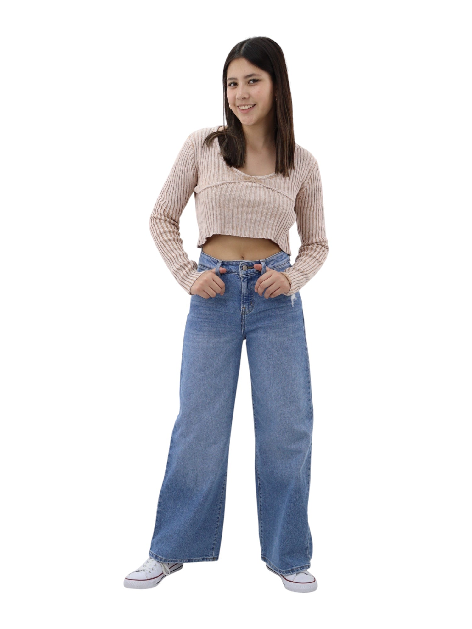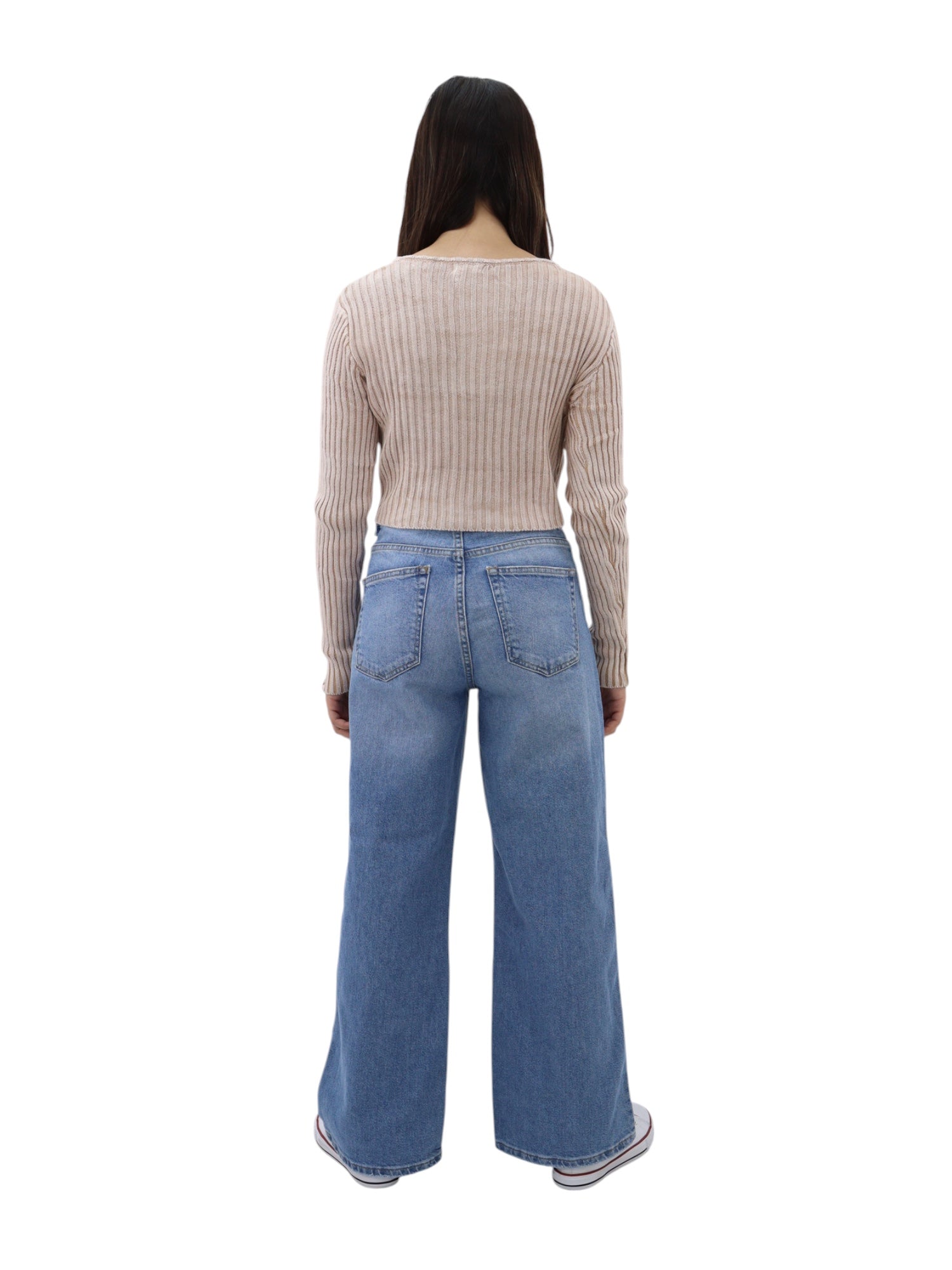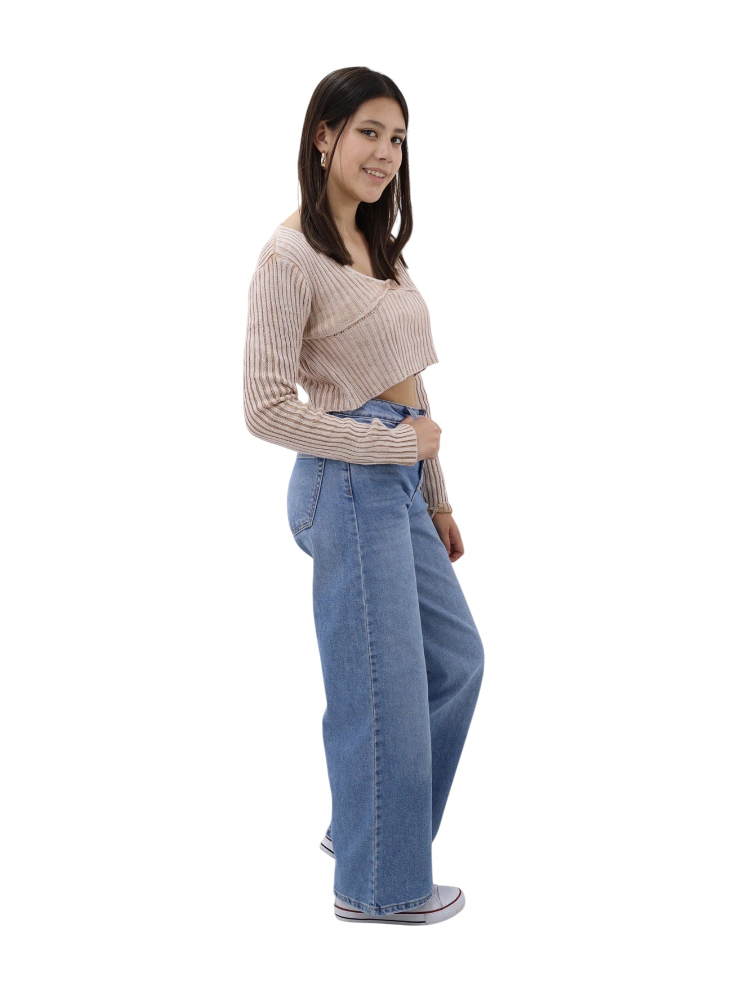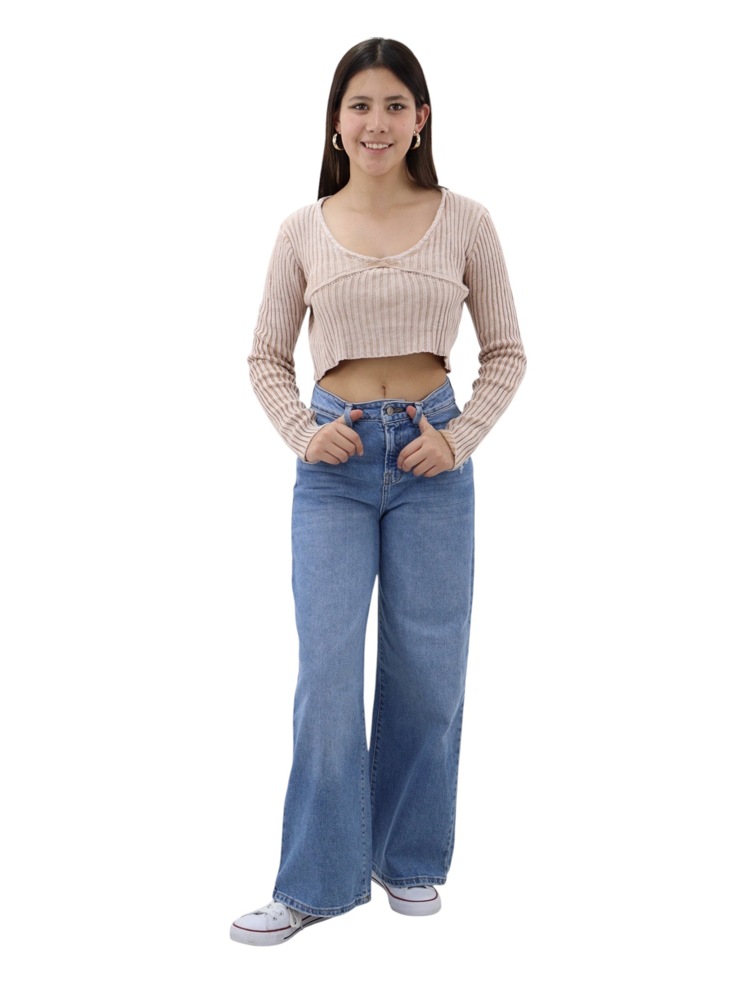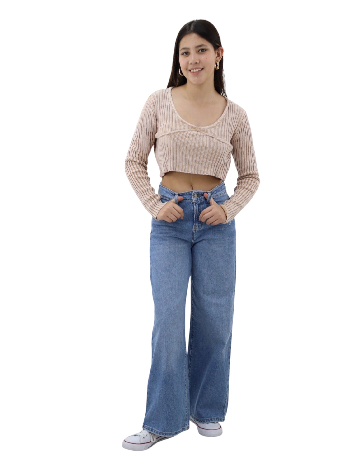 Suéter corto beige, manga larga, cuello redondo, suave, casual