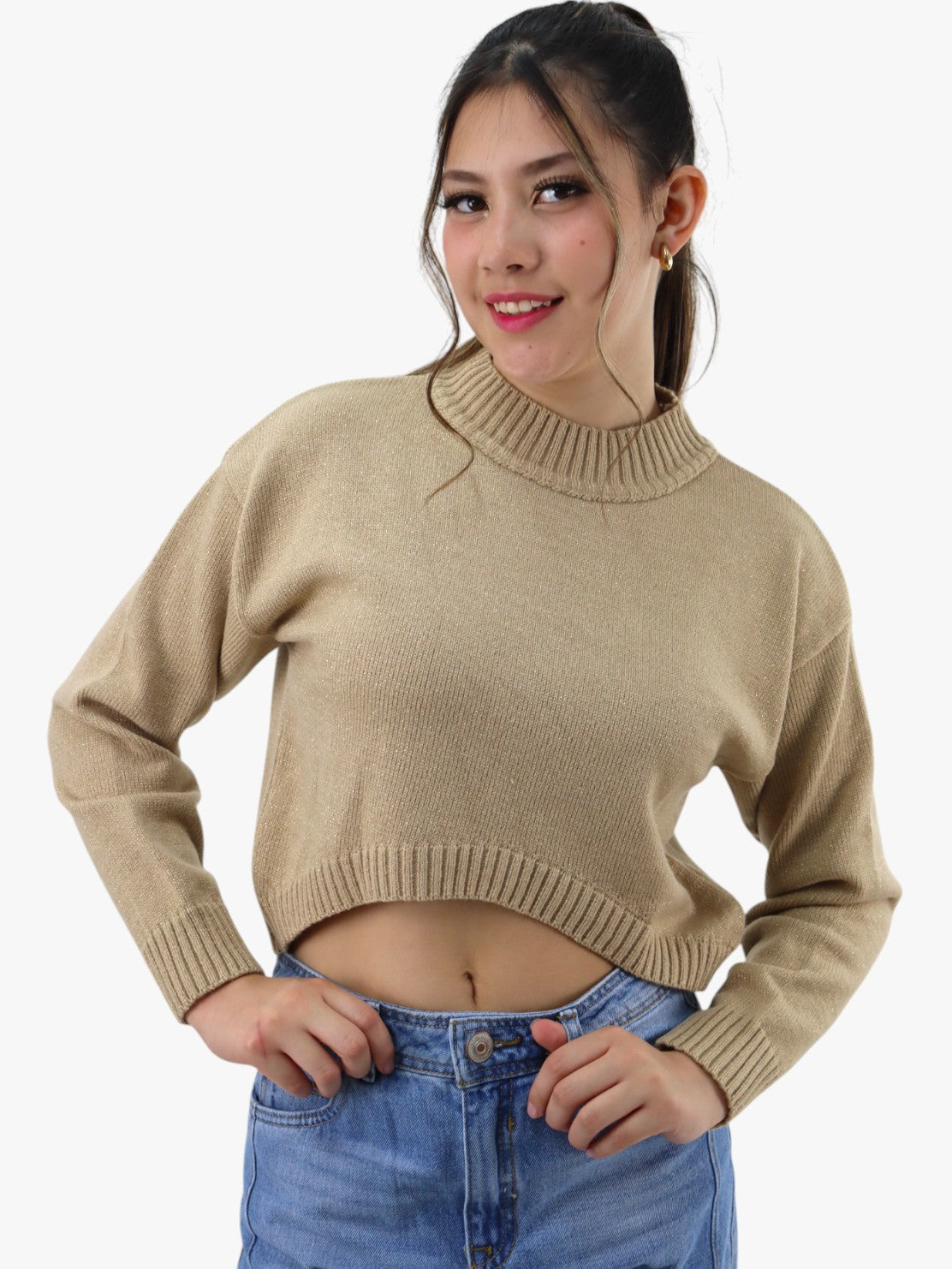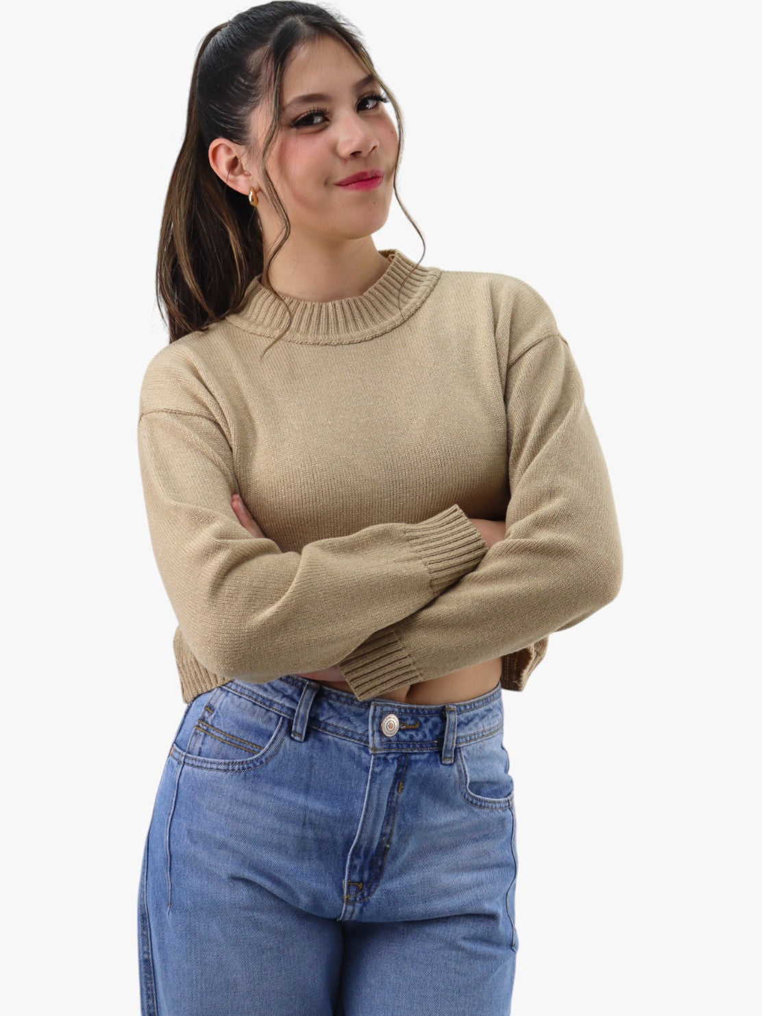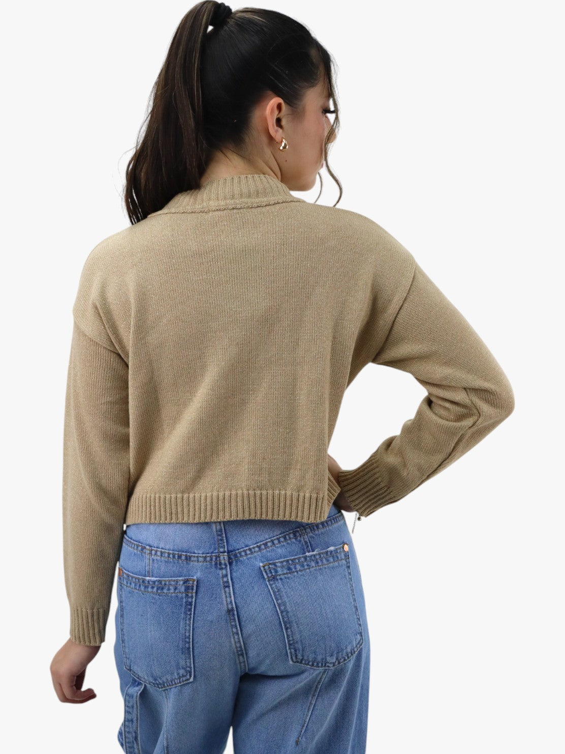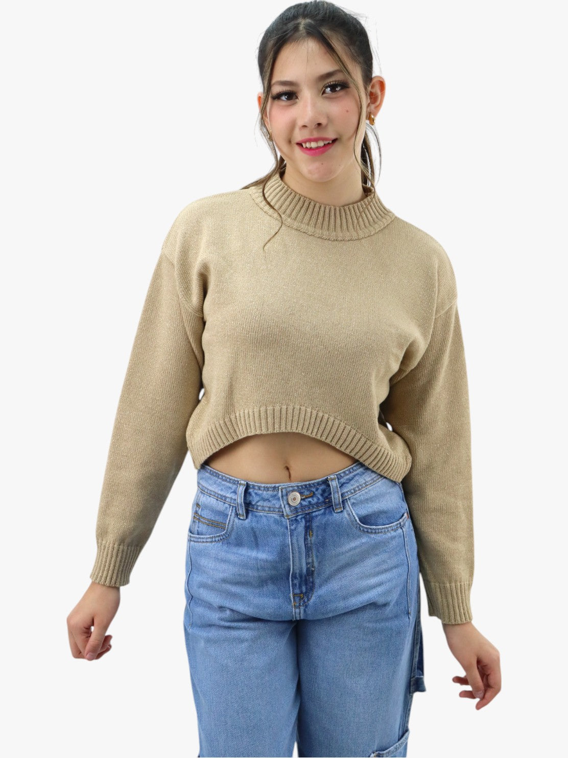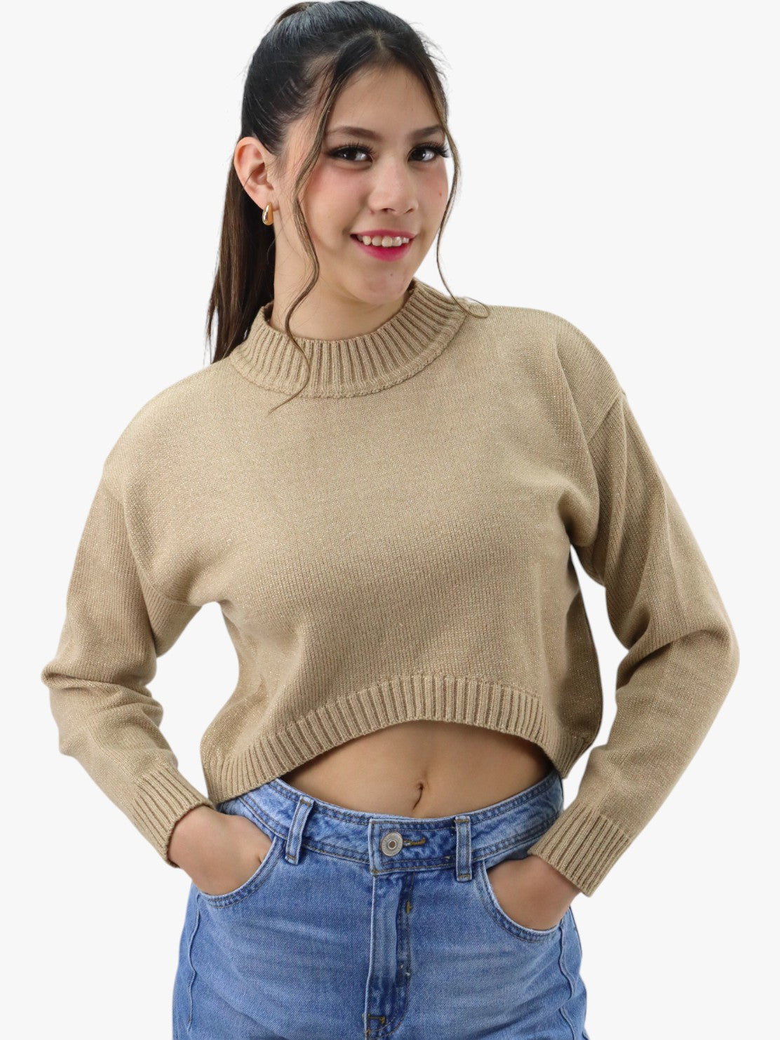 Suéter corto tejido de color camel con cuello alto