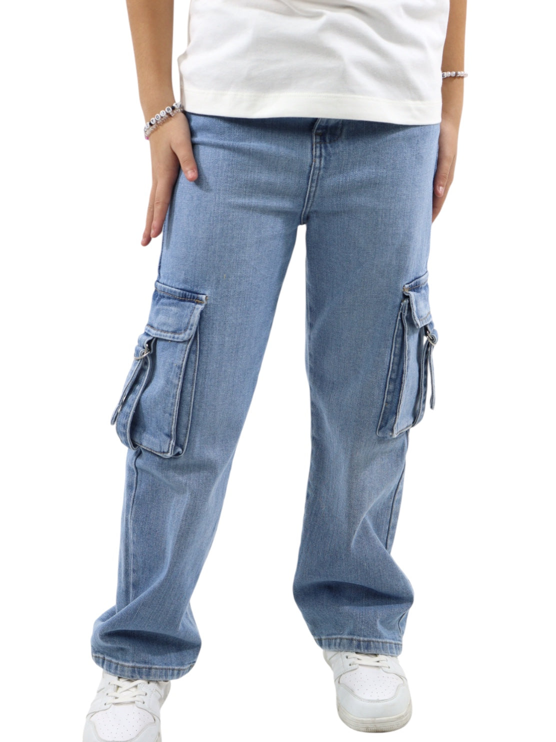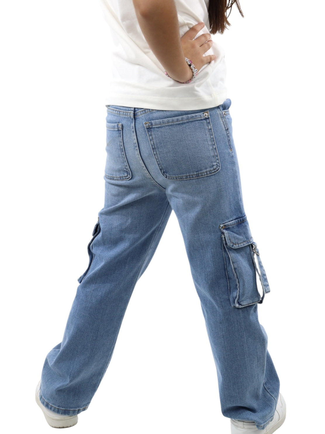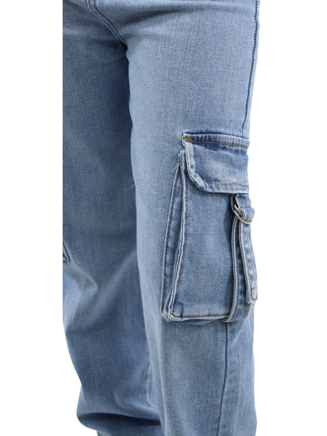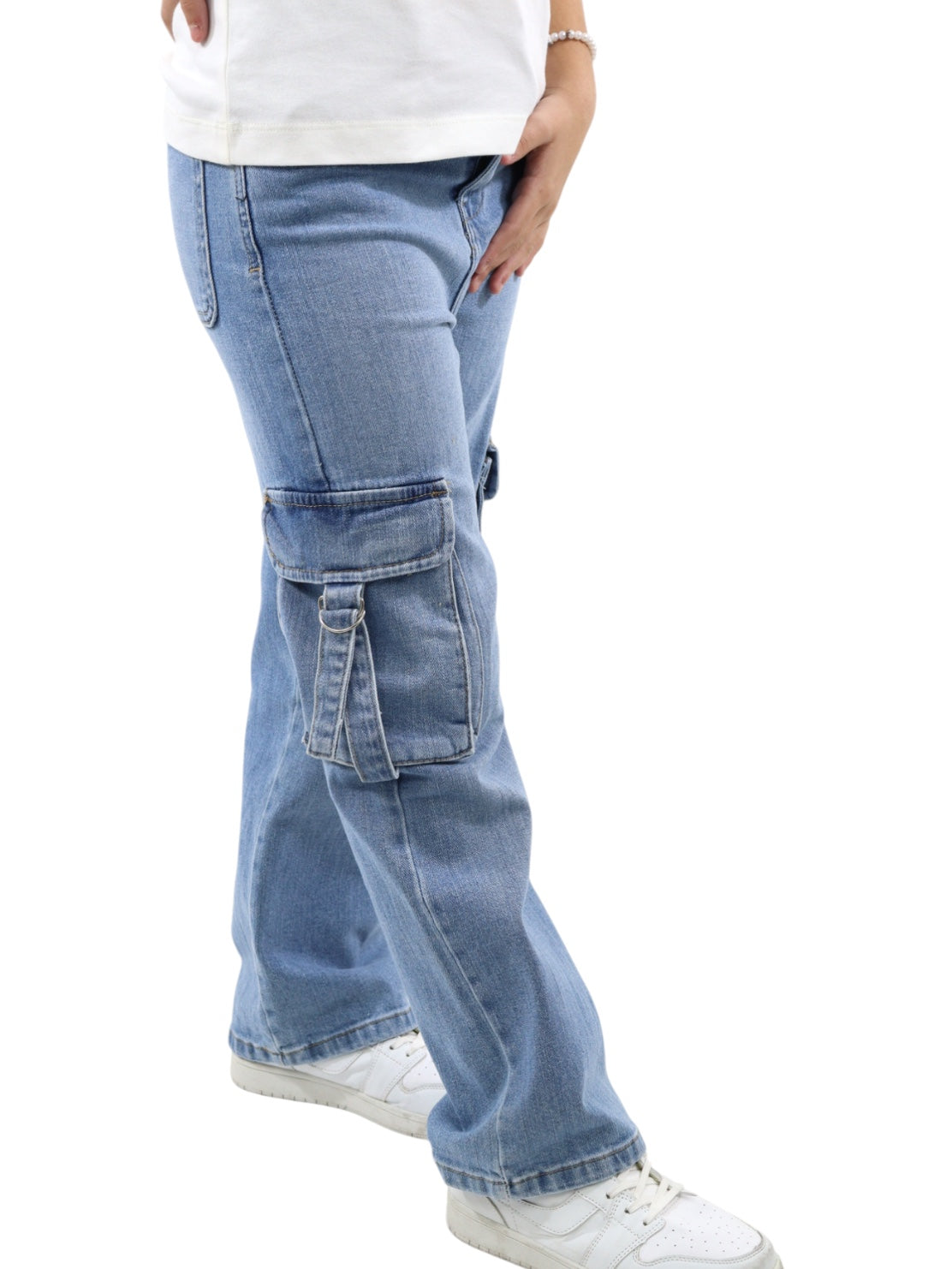 Jeans wide leg cargo de talle alto azul medio, ligeramente ensuciado, aspecto sucio, con bolsillos en la parte delantera y trasera, cierre de botón y cremallera y pierna recta.